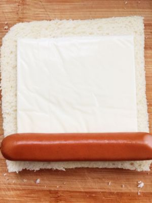 脆皮肠放一边,顺边卷起。脆皮肠上用刀划几下,洒点椒盐在上面