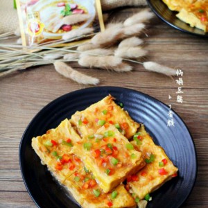 青红甜椒切小丁,蒜切末,豆腐切五六毫米左右厚度的片,鸡蛋打散