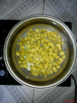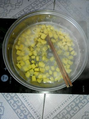 把腌制好的菠萝丁倒入锅中,加水至淹没菠萝,在水中加一点点盐,开火加热