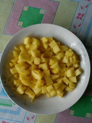菠萝切成小丁,撒上白糖拌匀,腌制半个小时