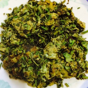 香椿放入锅里快速炒一下,颜色由棕变绿~