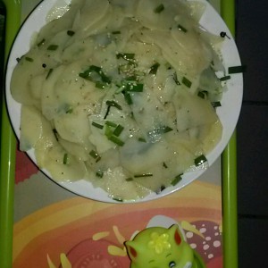 烧锅倒入少许色拉油,放入花椒,制作所谓的花椒油!油热,关火!把葱白,辣椒面,孜然倒入油锅,紧接着倒入土豆片,蒜片,盐,鸡精!翻炒拌匀,倒入葱绿,洒芝麻,出锅!注,最近有点上火,没有放辣椒面!放入辣椒面得会更有食欲!