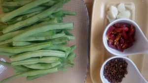 豆角洗净控干表面水分,准备蒜瓣,干辣椒,花椒,盐