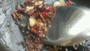 豆角煸熟盛出备用。锅底留油加热后放入蒜瓣,花椒,干辣椒炒翻出麻香味儿