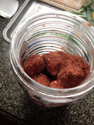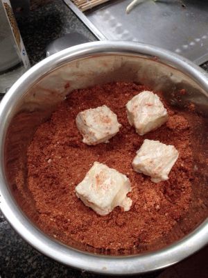 将所有调料放入较大的容器中,把发酵好的豆腐放入容器滚至全部裹上调料。