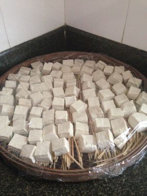 将豆腐切好放入稻草上,上面最好再加一层稻草,放在阴凉蔽光处放七天左右。