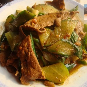 放入猪肝炒开,加黄瓜翻炒,放盐出锅装盘即成。