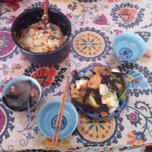 用姜片,葱花炝锅,放入木耳,加少许生抽,料酒,依次加入海带,鱼豆腐,白菜,大火略炒