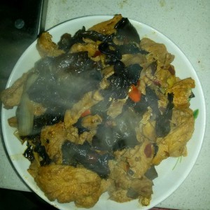 加入炸豆腐继续翻炒均匀,加入黑木耳翻炒均匀。加适量水,少许生抽和料酒,炒匀后盖上锅盖,中火闷三分钟。