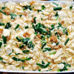 豆腐煮开后,加入芡汁。芡汁由盐,酱油,水淀粉做成,其实同腌肉沫的用料差不多。