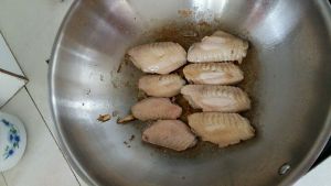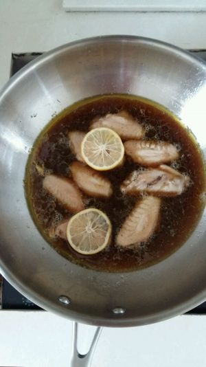 将鸡翅泡去血水,放3-5片柠檬腌渍35分钟,鸡翅再煎锅中煎娟两面金黄。