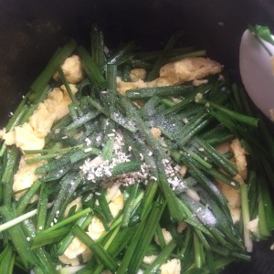 然后将韭菜倒入锅里和鸡蛋一起翻炒。