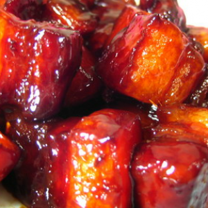 炒至焦糖色时下五花肉,快速翻炒使其均匀上色