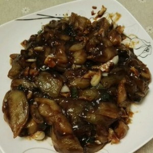 放入炸好的茄子,调好的料汁,另一半蒜,拌匀,出锅。