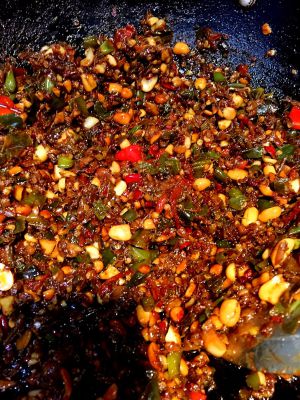 冷锅冷油炒花生米,炒熟后盛出,另外一个锅,加入切碎的辣椒,生姜,蒜头,盐,反复炒至没有水。同时有油的锅,再放些油,加入花椒炸出香味后倒入炒入的辣椒中,然后翻炒辣椒,直至辣椒微卷变色,加入豆瓣酱,翻炒,中小火熬至出红油,然后加入炒好的花生米(可碾碎,味道更香),放入适量白糖调味,即可出锅。