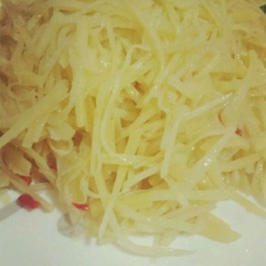 二:将切好的土豆丝放入水中,这样做可以去除土豆丝多余的淀粉!一定要用水多洗几遍,那样炒出来的土豆丝丝丝分明。。。