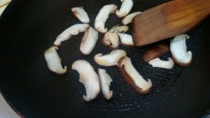 锅里少许油,倒入香菇,炒熟。