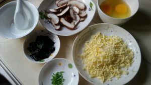 准备食材。香菇洗净切片,海苔剪成碎片。