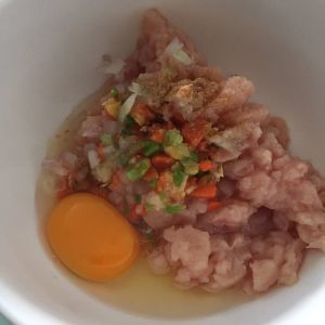 加入鸡蛋 和佐料 包括淀粉 搅拌上劲