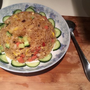 放酱油两勺,下胡萝卜丁和黄瓜丁,火腿肠丁,一起炒啊炒。最后起锅!