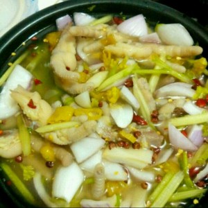 煮好后将芹菜,洋葱,鸡爪,藕丁放入容器