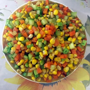 倒入玉米粒,胡萝卜丁,黄瓜丁,不断翻炒,快熟的时候倒入松子。