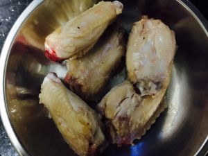 把鸡翅洗干净,用盐腌两小时,然后煎至两边微黄。
