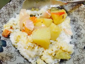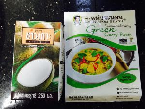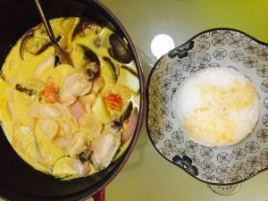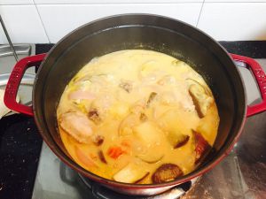 在锅里加点油,把混合好的青咖喱椰奶倒到锅里煮开。