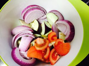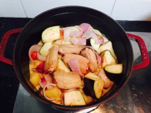 把鸡翅和杂菜一并倒入锅里焖煮。