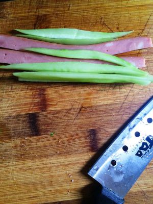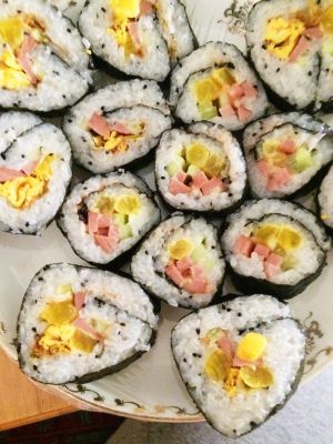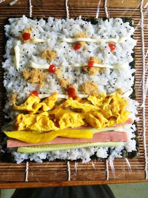 靠下方放鸡蛋,培根火腿,黄瓜条,大根萝卜条~一定要靠下,否则不容易卷