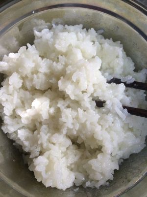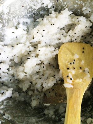 米饭加黑芝麻,盐,寿司醋,搅拌