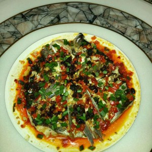再撒上鼓油关火后不打开锅盖。利用余热和蒸汽蒸两分钟取出。