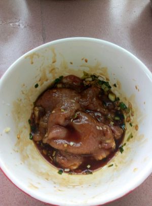 做调料,把白酒耗油酱油葱花姜米(就是姜切得很碎)混合,这个过程我忘记拍照了,把步骤三的肉片放进酱料里面。所有肉片都要均匀粘上姜汁,腌制最少一小时 如果腌了不马上吃要放入冰箱,注意放冰箱的一定要把多余的酱汁倒出来,否则肉片制作的时候会很闲