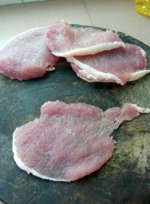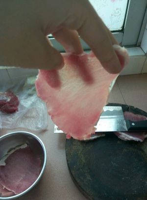 用松肉锤把肉片捶醒,再用刀背把其横竖捶出条纹(力度要把握好,切忌不可以把肉捶烂),这个过程有点累,我做的是四人份所以就费时长了点