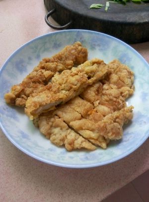 把裹了面粉的肉片放去蛋液里两面裹上蛋液,拿起来,把多余蛋液沥掉。