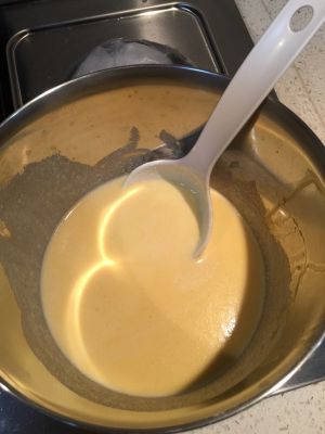 有勺子舀一勺过去黄油那里乳化发白,再倒进面粉糊里面搅拌一下,再过筛就可以煎皮