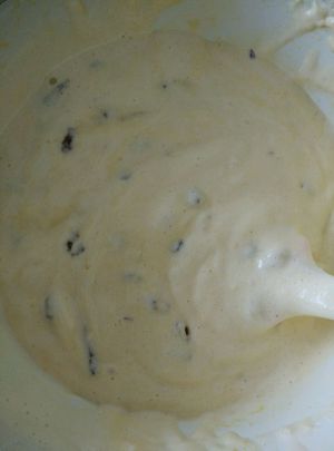 切碎的大枣、葡萄干和椰蓉加入蛋糕糊里翻拌匀,然后倒入色拉油翻拌均匀。