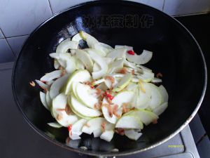 滑入菜瓜片翻炒。将泡虾仁的黄酒也倒入,放入适量的盐,菜瓜就会出水,不用加水。