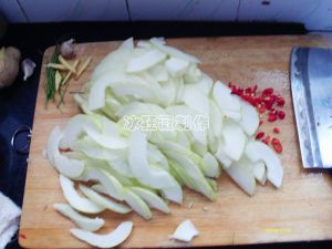 菜瓜切片,辣椒切成辣椒碎,姜切丝,葱切成细段