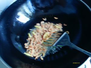 起油锅,入姜丝,一半的葱花爆香,倒入开洋,再次加入黄酒