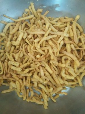 锅中倒油约七八成热放入切好的面条,先用小火炸一会再开中火,炸至用筷子一动有响身声再改小火炸至变色捞出控油