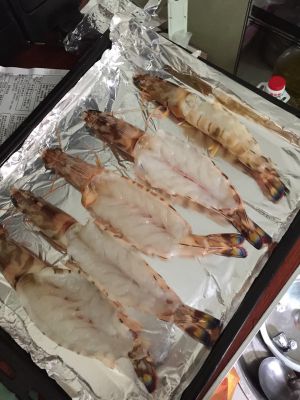 大虾开背去虾线洗净 平铺在烤盘上 肉上撒上少许盐