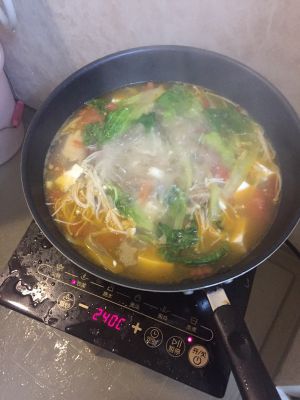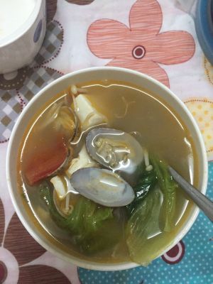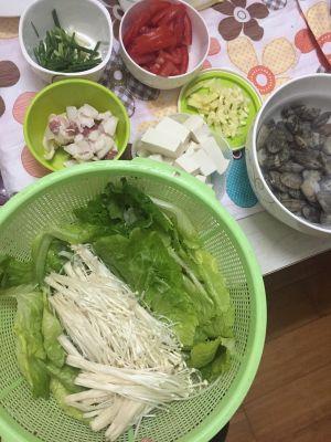 西红柿炒出酱,加入花甲,姜蒜,略炒。加入开水烧开,加金针菇,豆腐等