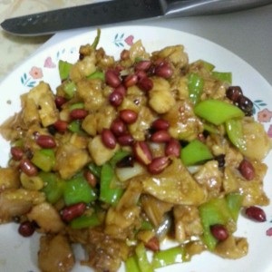 加入炒好的鸡肉丁,酱油,料酒翻炒,加入盐鸡粉,糖调味翻炒,汤汁收稠后加入炒好的花生(可根据口味加入陈醋)