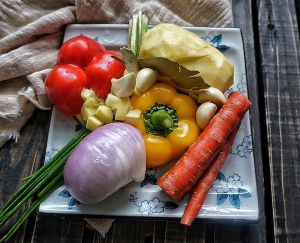 准备好搭配的各类蔬菜,洗净,洋葱切碎丁,胡萝卜、土豆切块,彩椒切丝,蒜头切碎粒,生姜切块。