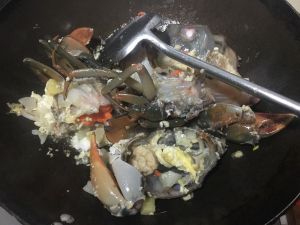 倒入螃蟹和剩余的蛋液,继续翻炒均匀后盛出。