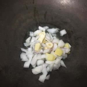 锅中倒入适量油,加入部分洋葱,大蒜,姜爆香。