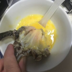 准备一个鸡蛋,打成蛋液,把切好的螃蟹刷上蛋液