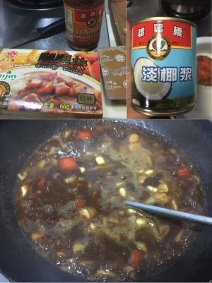 加入剩余的蔬菜炒香后,加入咖喱酱和咖喱块,加入椰浆和适量的水。