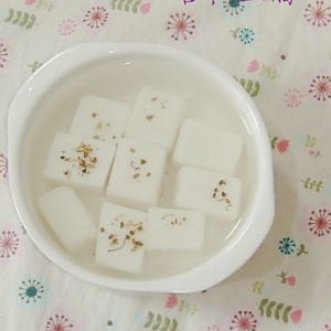 将杏仁豆腐切块放入碗中,盛一些桂花糖水就可以吃了